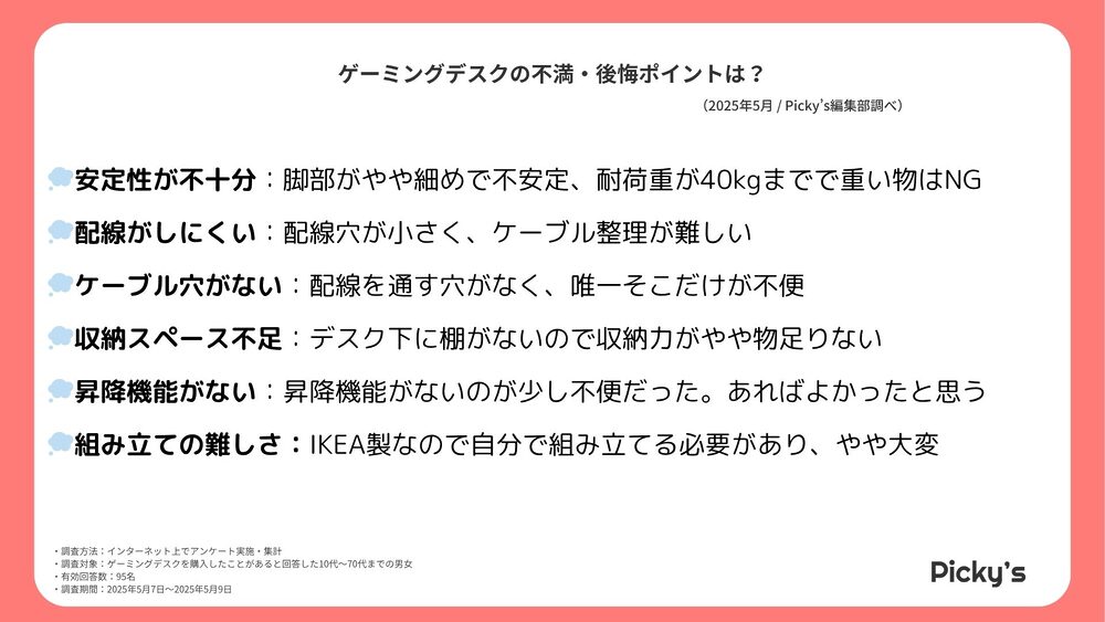 一方、後悔ポイントとして最も多く挙がったのは「モニターの安定性が不十分」「配線がしにくい」といった構造的な使いづらさだった。「モニターアームをつけたら天板がたわんだ。耐荷重は確認必須」「配線穴がないのでコードがごちゃごちゃ。整理しづらい」といった具体的な不満が挙がっている。