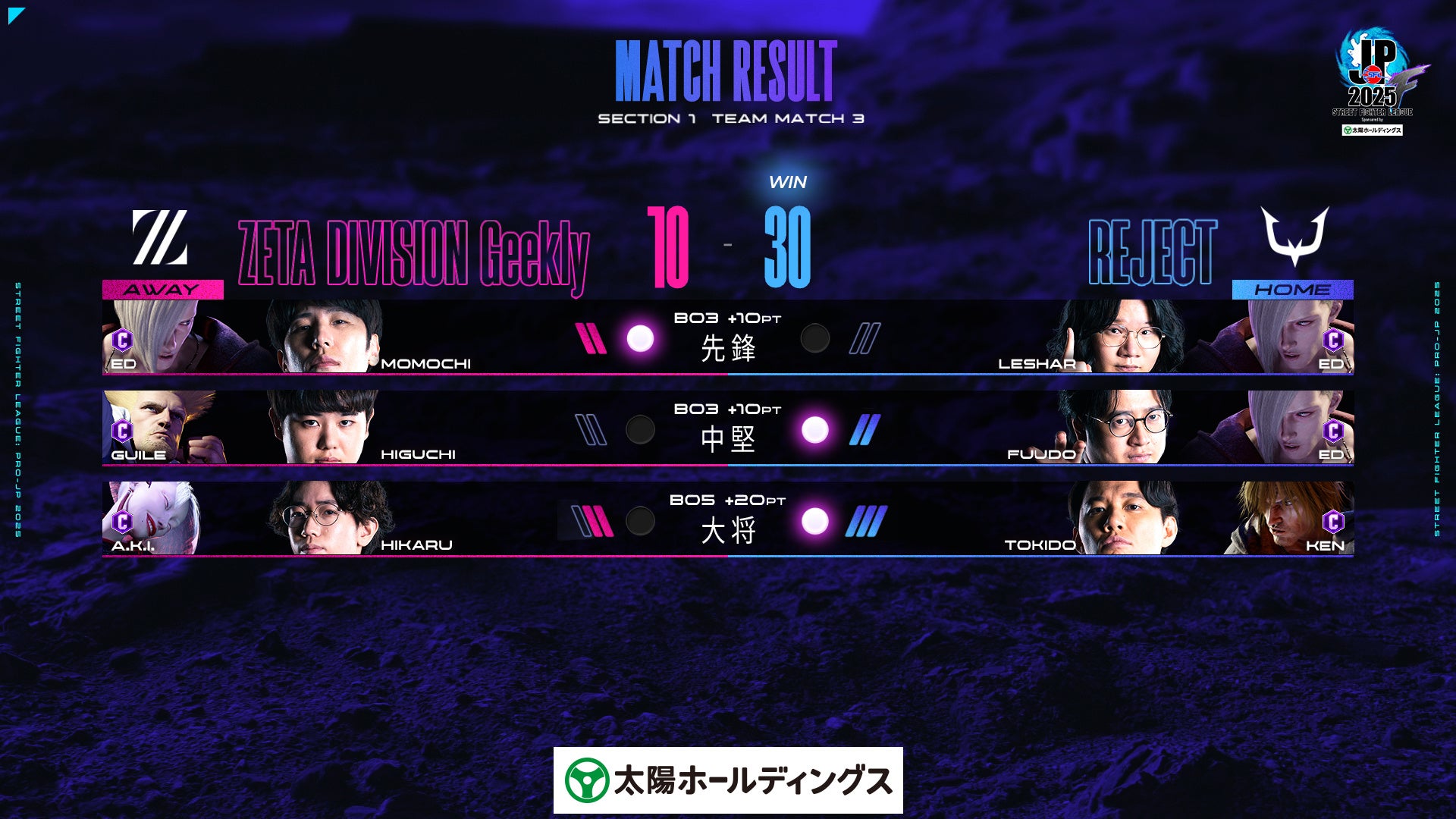 大将戦はひかる選手(A.K.I.)とときど選手(ケン)の対戦となった。一進一退の攻防を見せる試合は最終BATTLEまでもつれ込み、最後はA.K.I.のスーパーアーツLv.1「死屍累々」の切り返しを読み切りガードしたときど選手が、ケンのスーパーアーツLv.3「神龍烈破」まで完走しK.O.を決め、10-30でREJECTが勝利を飾った。