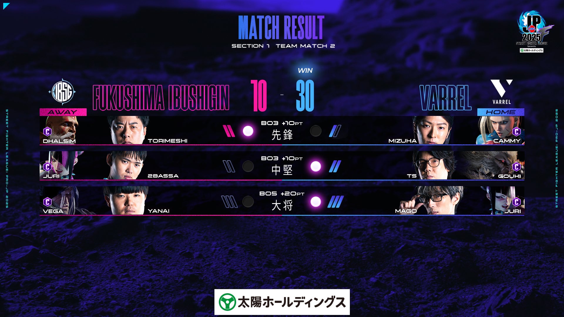 第2試合では、先鋒戦で鶏めし選手(ダルシム)が水派選手(キャミィ)に勝利し、中堅戦ではts選手(豪鬼)が2BASSA選手(ジュリ)を下した。