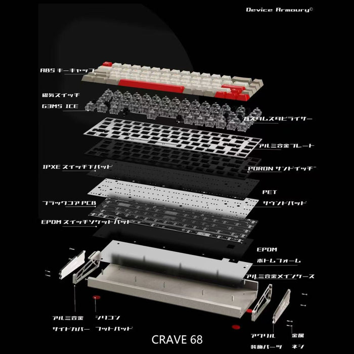 CRAVE68は「コスパ最強」を謳うゲーミングキーボードとして開発された。本体にはCNCフルアルミニウムシェルを採用し、重量は約1.5kgとなっている。接続方式は有線のみで、特別チューニングにより「一流の打鍵感と打鍵音を実現」したとしている。